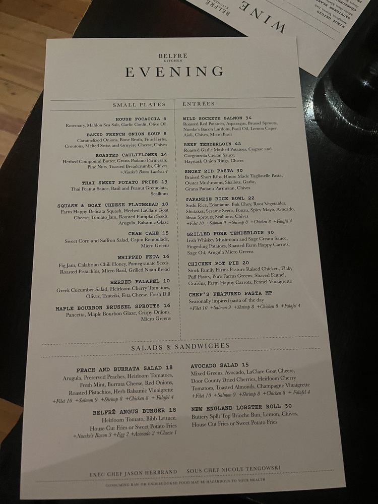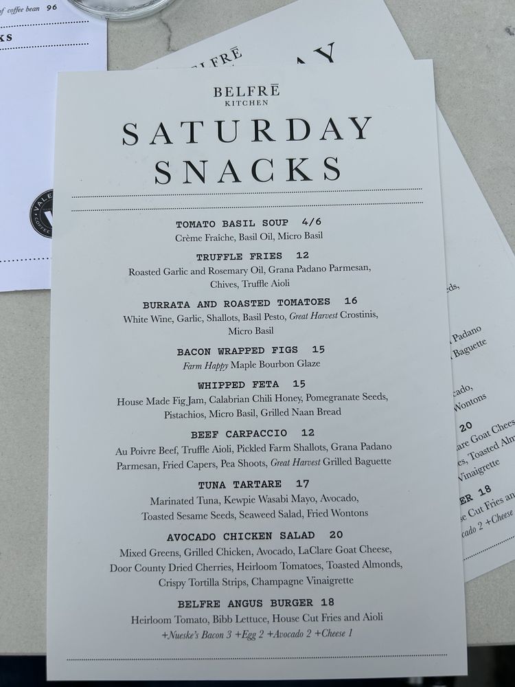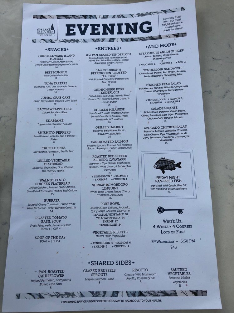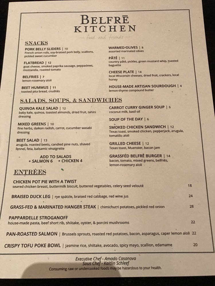Introducing the menu of Belfre Kitchen, a charming restaurant in Delafield, WI, specializing in Tapas/Small Plates and New American cuisine. With a focus on fresh ingredients and unique flavors, Belfre Kitchen offers a variety of options for breakfast, brunch, lunch, and dinner. From Bacon-Wrapped Figs with Spiced Maple-Bourbon Glaze to Maryland Crab Cakes and Roasted Cauliflower with Herbed Compound Butter, the menu is filled with delectable dishes. Vegetarian options are plentiful, and the restaurant also caters to various dietary preferences. The ambiance is casual yet classy, with outdoor seating available. The full bar offers a selection of wines, cocktails, and beers to complement your meal. With excellent service and a cozy atmosphere, Belfre Kitchen is a must-try dining destination for food enthusiasts seeking a memorable culinary experience.